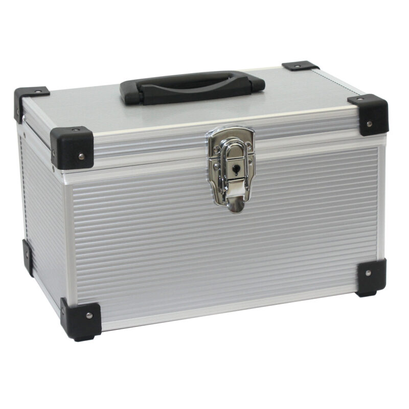 Store all your valuable CD and DVD’s in this high strength aluminium CD box that will hold up to 200 discs – silver lined effect with black protective corners and black handle.