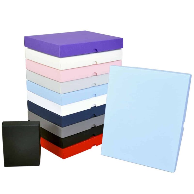 Made from stiff 350 gsm card. All boxes are 1″ (25mm) deep and available in 10 colours. The boxes are supplied flat but are very easy to assemble.