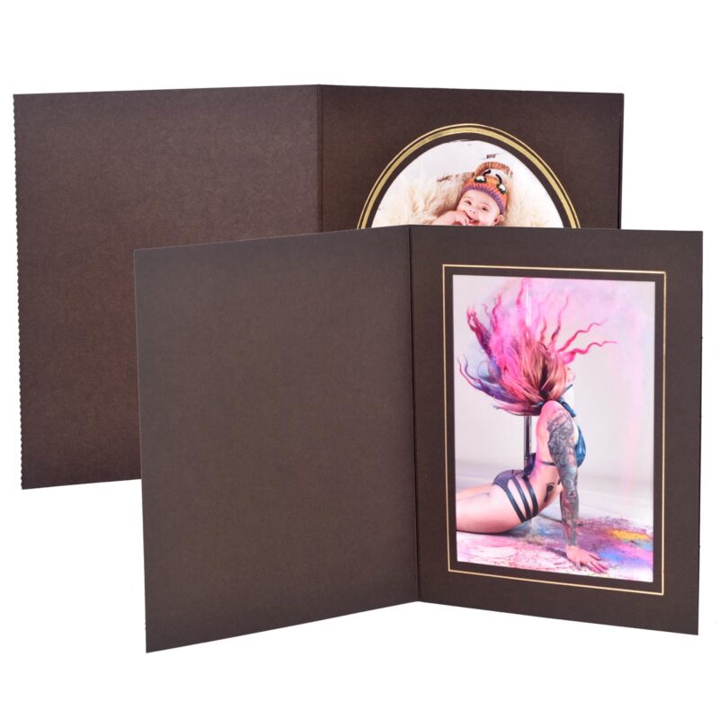 Emerald Brown Slip-in Photo Folders – in popular sizes, high quality dark brown board slip-in photo folders. Gold foil logo and deckle edging. Double line blocking around aperture.