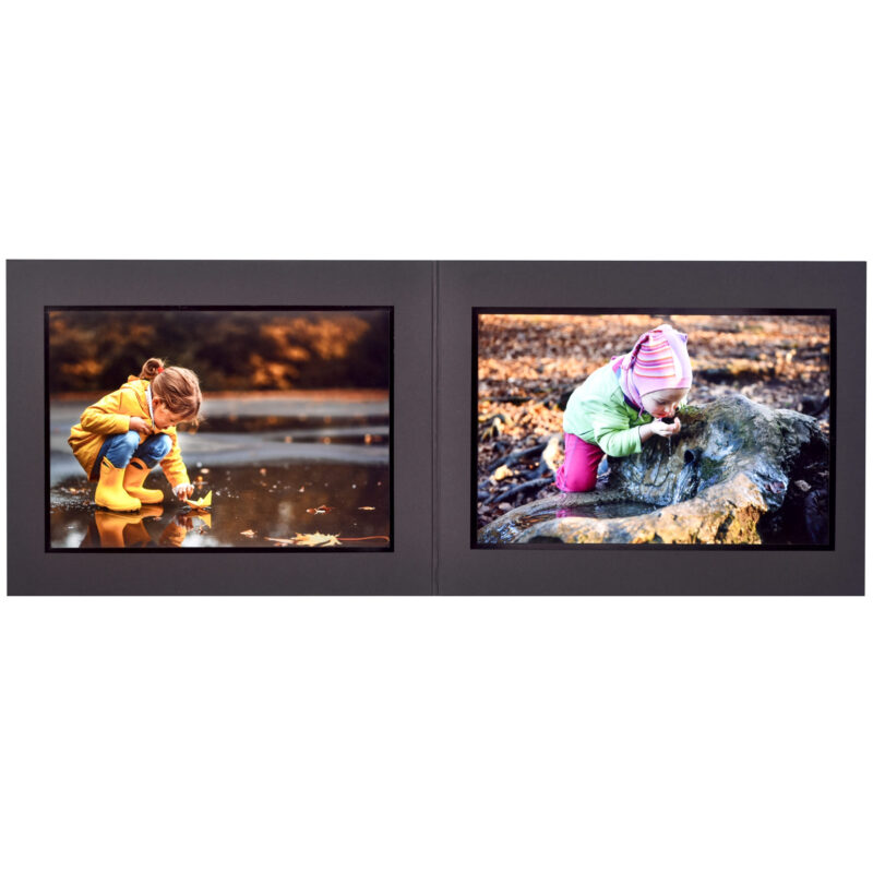 Featureline Double Photo Folder 12″ x 8″ | A4 Landscape Black – has one 12″ x 8″ and one A4 aperture. Allows you to have an A4 certificate on the left and a 12″ x 8″ print on the right (just turn around if you want the 12″ x 8″ on the left & A4 on the right). Portrait orientation folder is also available. Also available are double A4 or double 12″ x 8″ folders.