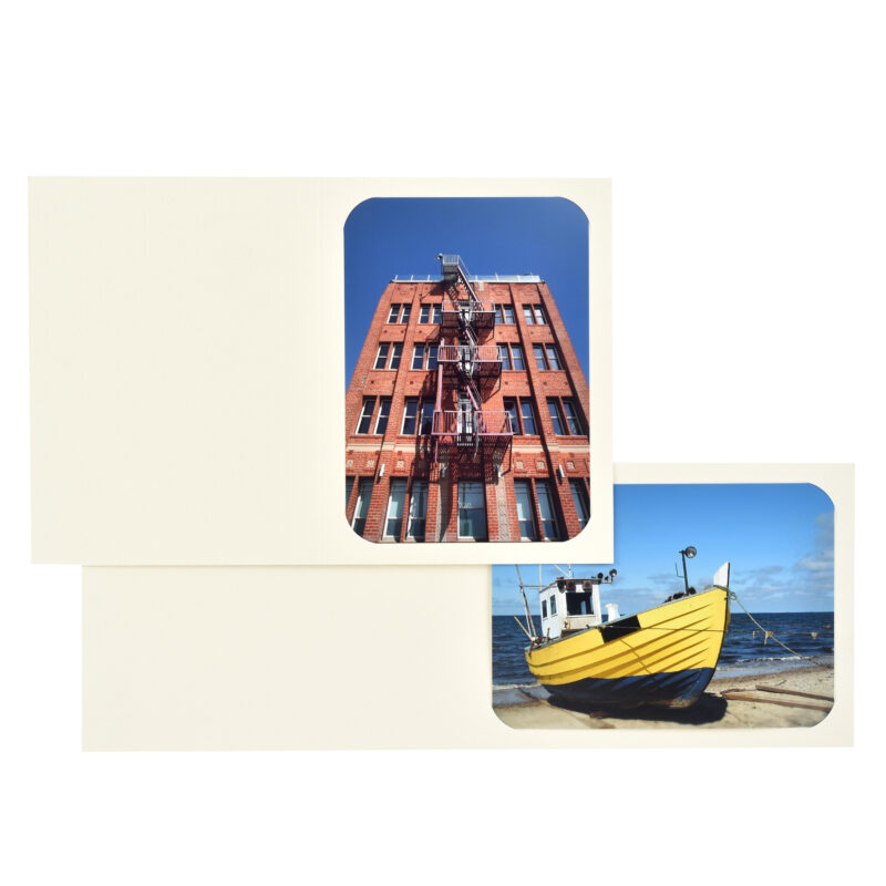 Fresco Ivory Cut Corner Photo Folders – medium weight ivory cut corner photo folders in the 6″ x 4″ aperture size. Singles available.