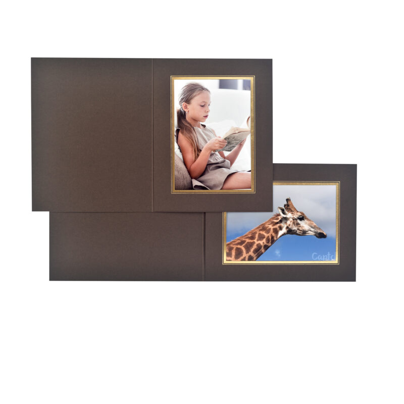 Harewood Brown & Gold Slip-in Photo Folders – economy medium weight matt folder with gold border around the aperture.