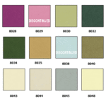 8001: SNOW WHITE, 8002: CHINA WHITE, 8003: NEW CREAM, 8004: FAWN, 8005: MID BROWN, 8006: OMAR BROWN, 8007: BAGHDAD, 8008: SILVER GREY, 8009: PUTTY, 8010: DARK GREY, 8011: BLACK, 8012: LENTIL, 8013: TERRACOTTA, 8014: SILURIAN BLUE, 8015: RAW SILK, 8016: MAROON, 8017: MID GREEN, 8018: DAMASCUS GREEN, 8019: DULL GREEN, 8020: VERMILLION, 8023: SPICE BROWN, 8024: SEPIA, 8026: SMOKE, 8027: DARK GREEN, 8028: DEEP PINK, 8029: PINK, 8030: PALE GREEN, 8032: OLIVE, 8034: SAGE, 8035: BUFF, 8038: PALE BLUE, 8040: MALT, 8043: IVORY, 8044: MUSHROOM, 8045: MID GREY, 8048: IVORY ART, 8050: TUDOR ICE, 8051: LIGHT BLUE, 8052: STONE, 8053: MID BLUE, 8054: ROYAL BLUE, 8055: MONUMENT GREY, 8057: APRICOT, 8058: NEWBURY MOSS, 8059: LIGHT FAWN, 8061: PALE BUFF, 8062: LAVENDER, 8064: ODESSA PINK, 8065: HAYSEED, 8066: WILD OATS, 8069: LIGHT GREY, 8070: DAWN GREY, 8071: DARK BLUE, 8078: BURGUNDY, 8087: DEEP BLUE, 8142: PINK CHAMPAGNE, 8143: LAKELAND GREEN, 8144: CLOUD WHITE, 8145: ALABASTER, 8146: DAMSON, 8148: ROYAL NAVY, 8149: PRIMROSE, 8150: MOORLAND GREEN, 8151: BEAUJOLAIS, 8154: ICE BLUE, 8159: SLATE GREY, 8162: IVY GREEN, 8166: SEA BLUE, 8168: ALPINE BLUE, 8170: DAFFODIL, 8171: SAND, 8173: KENDAL GREEN, 8175: RUST, 8178: BRIGHT GREEN, 8213: CREAM, 8221: DEVON CREAM, 8223: ARCTIC WHITE, 8238: DOVE, 8411: APPLE GREEN, 8416: GUACAMOLE, 8426: SALISBURY GREEN, 8427: BURMA BUFF, 8491: EURO GREY, 8594: LIGHT DENIM, 8595: DARK DENIM, 8601: PALE PINK, 8604: DULL PEACH, 8605: GINGER ROOT, 8606: MAPLE, 8608: MAGNOLIA, 8611: MUSTARD YELLOW, 8613: CLAY, 8614: GREEN, 8616: GRASMERE GREEN, 8618: ELISE GREEN, 8620: CHASTE WHITE, 8623: LEMON, 8625: GORSE BLUE, 8626: ANDOVER CREAM, 8627: MINUET, 8628: IVORY POWDER, 8629: OLD IVORY, 8630: PALE PEACH, 8631: PALE ORGANZA, 8632: PALE GREY, 8633: MORNING DEW, 8635: DAWN GREEN, 8636: CHOCOLATE SURPRISE, 8637: TURQUOISE MIST, 8638: ROYAL BLUE TWILIGHT, 8640: IMPERIAL BLUE, 8643: CONGO GREEN, 8644: DUSK, 8645: MOSS POINT GREEN, 8651: RAIN SHIMMER, 8652: VELLUM, 8653: OCHRE, 8654: DOVER GREY, 8655: CANDY ROSE, 8657: TOPAZ, 8658: BLUE, 8659: SILENT PATH, 8661: AVILLON WHITE, 8662: CASTILE IVORY, 8663: SEPIA TINT, 8664: ARAGON GREY, 8665: TERRAZZO GREY, 8674: PALE IVORY, 8675: ALPINE WHITE, 8682: RED SUN, 8683: LIME, 8686: OCEAN BLUE, 8687: SAPPHIRE BLUE, 8694: CORNFLOWER, 8695: BAMBOO, 8698: GLACIER, 8699: FOOTBALL RED, 8805: SKY, 8806: HERITAGE BLUE, 8814: BRICK, 8816: MOUSSAKA, 8968: ONYX, 8977: BRIGHT WHITE