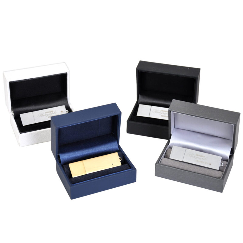 8GB, 16GB, 32GB or 64GB Rectangular USB flash memory (often called flash drive or memory stick) presented in a luxury hinged box with lined interior. The perfect way to present your digital images.