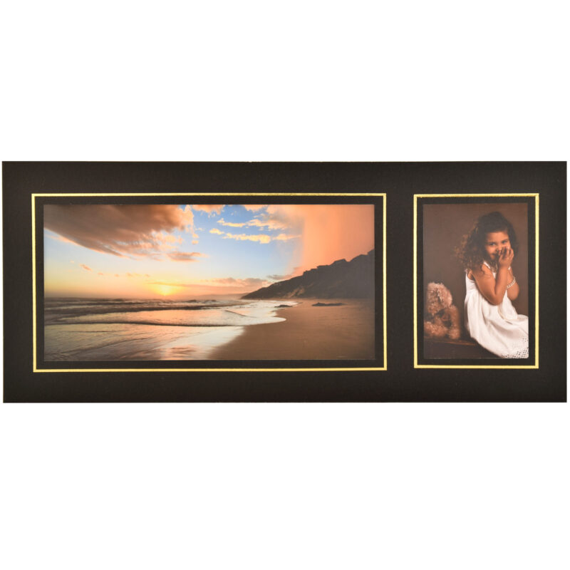 Onyx Dual Photo Strut Mount 10″ x 5″ + 5″ x 3.5″ Black & Gold – ideal for groups, presentations, club events, etc. Gold foil aperture lines.