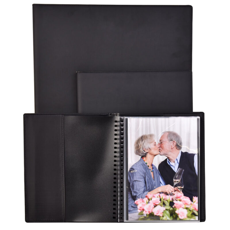 Soft padded leather look outer with a Spiral bound spine, inside the presenter are two interior pockets.